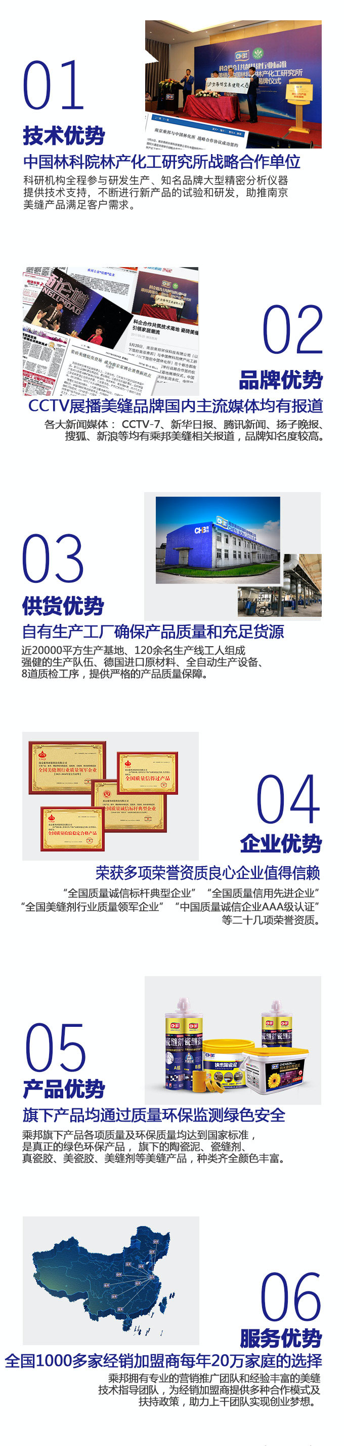 南京乘邦環(huán)??萍加邢薰境闪⒂?005年,是集南京瓷磚美縫、南京美縫施工、美縫劑產(chǎn)品的研發(fā)與銷(xiāo)&售等產(chǎn)業(yè)的南京瓷磚美縫公司。目前公司主打美縫產(chǎn)品為國(guó)內(nèi)推出的傳統(tǒng)美縫劑升級(jí)產(chǎn)品:乘邦納米陶瓷泥、水性環(huán)氧彩砂,天然砂質(zhì)顏料,化妝品般安全無(wú)污染。乘邦陶瓷泥顏色豐富,大大提升裝飾效果,打造魔幻家居,讓家也可以炫酷起來(lái)。它綠色環(huán)保防霉防污,堅(jiān)硬如瓷細(xì)膩光潔,不僅做到瓷磚縫隙“不變黑”,而且在為每一個(gè)家庭健康美麗而努力,這是乘邦公司的最高準(zhǔn)則,也是乘邦人為之努力奮斗的目標(biāo),以此目標(biāo)乘邦本著"誠(chéng)信、合作、專(zhuān)業(yè)、超越"的理念,詮釋優(yōu)質(zhì)服務(wù),演繹品質(zhì)生活。同時(shí)公司擁有一支管理完善、經(jīng)驗(yàn)豐富的專(zhuān)業(yè)美縫施工隊(duì)伍。在南京瓷磚美縫價(jià)格方面也有很大的優(yōu)勢(shì),每年為南京近萬(wàn)家庭提供美縫服務(wù),其自主研發(fā)的乘邦牌產(chǎn)品在10余省市已有近千個(gè)代理商,在全國(guó)范圍內(nèi)享有很高的知名度。